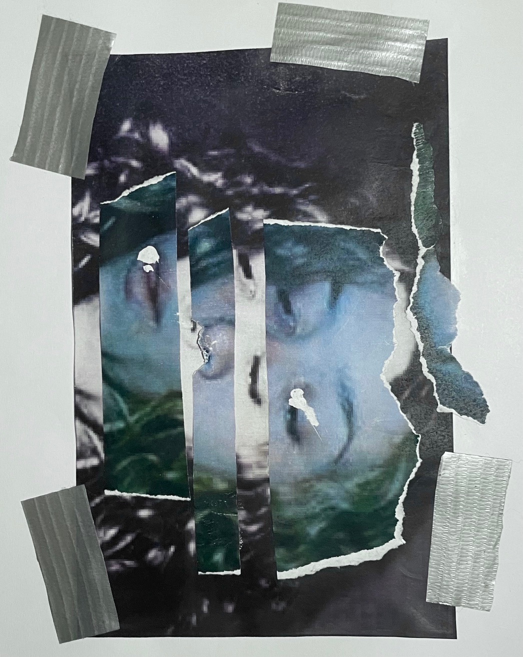 I am an interdisciplinary artist working primarily with printed imagery. Through acts of destruction such as slicing, cutting and tearing, followed by careful reassemblage through duct tape or paste, I aim to reflect the nuances present within various images. I generally focus on a variety of topics related to human immorality, such as addiction, corruption, and deviance. These creative works are supported by research and written text to make sense of the careful demolition and reassemblage of each composition.